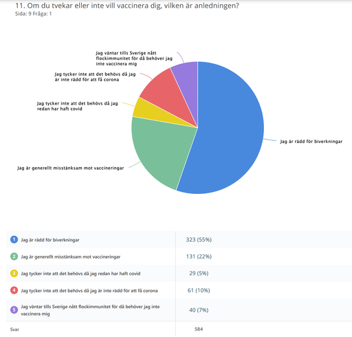 Just oron för biverkningar uppges av de flesta vaccinationsmotståndarna som anledningen till att de inte vill vaccinera sig – 55 procent av vaccinationsmotståndarna säger att detta är anledningen. 22 procent av vaccinationsmotståndarna säger att de generellt är misstänksamma mot vaccineringar. Fem procent av motståndarna uppger att de inte behöver vaccin eftersom de redan haft covid. Tio procent av vaccinationsmotståndarna uppger att de ”inte är rädda” att få covid medan sju procent väntar tills Sverige nått flockimmunitet för då behöver de inte vaccinera sig.
