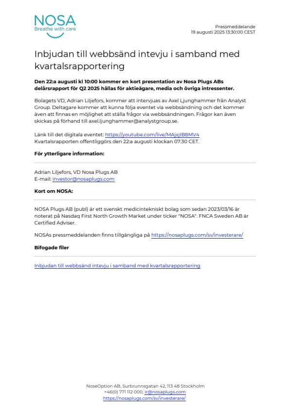 Den 22:a augusti kl 10:00 kommer en kort presentation av Nosa Plugs ABs delårsrapport för Q2 2025 hållas för aktieägare, media och övriga intressenter.