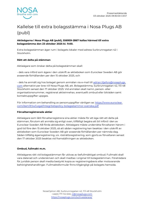 Aktieägarna i Nosa Plugs AB (publ), 556959-2867 kallas härmed till extra bolagsstämma den 23 oktober 2025 kl. 11:00.
