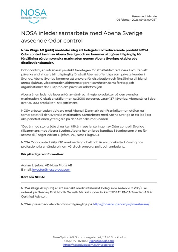 Nosa Plugs AB (publ) meddelar idag att bolagets luktreducerande produkt NOSA Odor control tas in av Abena Sverige och nu kommer att göras tillgänglig för försäljning på den svenska marknaden genom Abena Sveriges etablerade distributionskanaler.