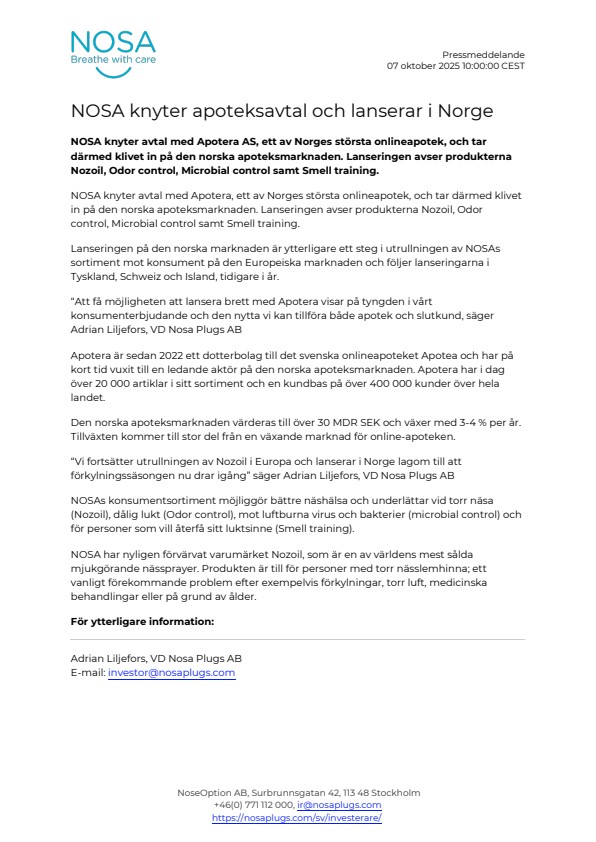 NOSA knyter avtal med Apotera AS, ett av Norges största onlineapotek, och tar därmed klivet in på den norska apoteksmarknaden. Lanseringen avser produkterna Nozoil, Odor control, Microbial control samt Smell training.