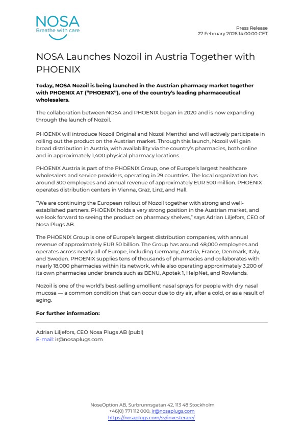 “We are continuing the European rollout of Nozoil together with strong and well-established partners. PHOENIX holds a very strong position in the Austrian market, and we look forward to seeing the product on pharmacy shelves,” says Adrian Liljefors, CEO of Nosa Plugs AB.