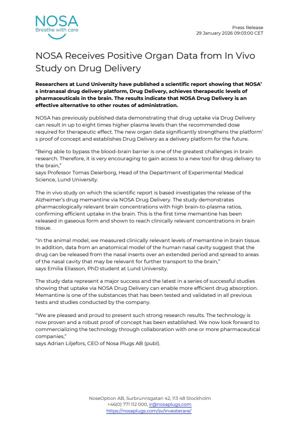 Researchers at Lund University have published a scientific report showing that NOSA’s intranasal drug delivery platform, Drug Delivery, achieves therapeutic levels of pharmaceuticals in the brain. The results indicate that NOSA Drug Delivery is an effective alternative to other routes of administration.