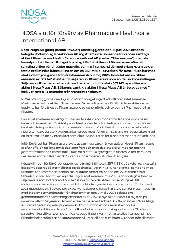 Nosa Plugs AB (publ) (nedan ”NOSA”) offentliggjorde den 16 juni 2025 att dess helägda dotterbolag NoseOption AB ingått ett avtal avseende förvärv av samtliga aktier i Pharmacure Health Care International AB (nedan ”Pharmacure”) med sin huvudprodukt Nozoil. Bolaget har idag tillträtt aktierna i Pharmacure efter att samtliga villkor för tillträdet uppfyllts och har i samband därmed erlagt 47,5% av den totala preliminära köpeskillingen om ca 25,7 MSEK . Styrelsen för Nosa Plugs har med stöd av bemyndigande från årsstämman den 9 maj 2025, beslutat om en riktad emission av 563 142 st aktier till säljaren av Pharmacure som en del av köpeskillingen. Säljaren av Pharmacure har därmed tecknat och tilldelats 563 142 nyemitterade aktier i Nosa Plugs AB. Säljarens samtliga aktier i Nosa Plugs AB är belagda med ”lock up” under 12 månader från transaktionsdatum.